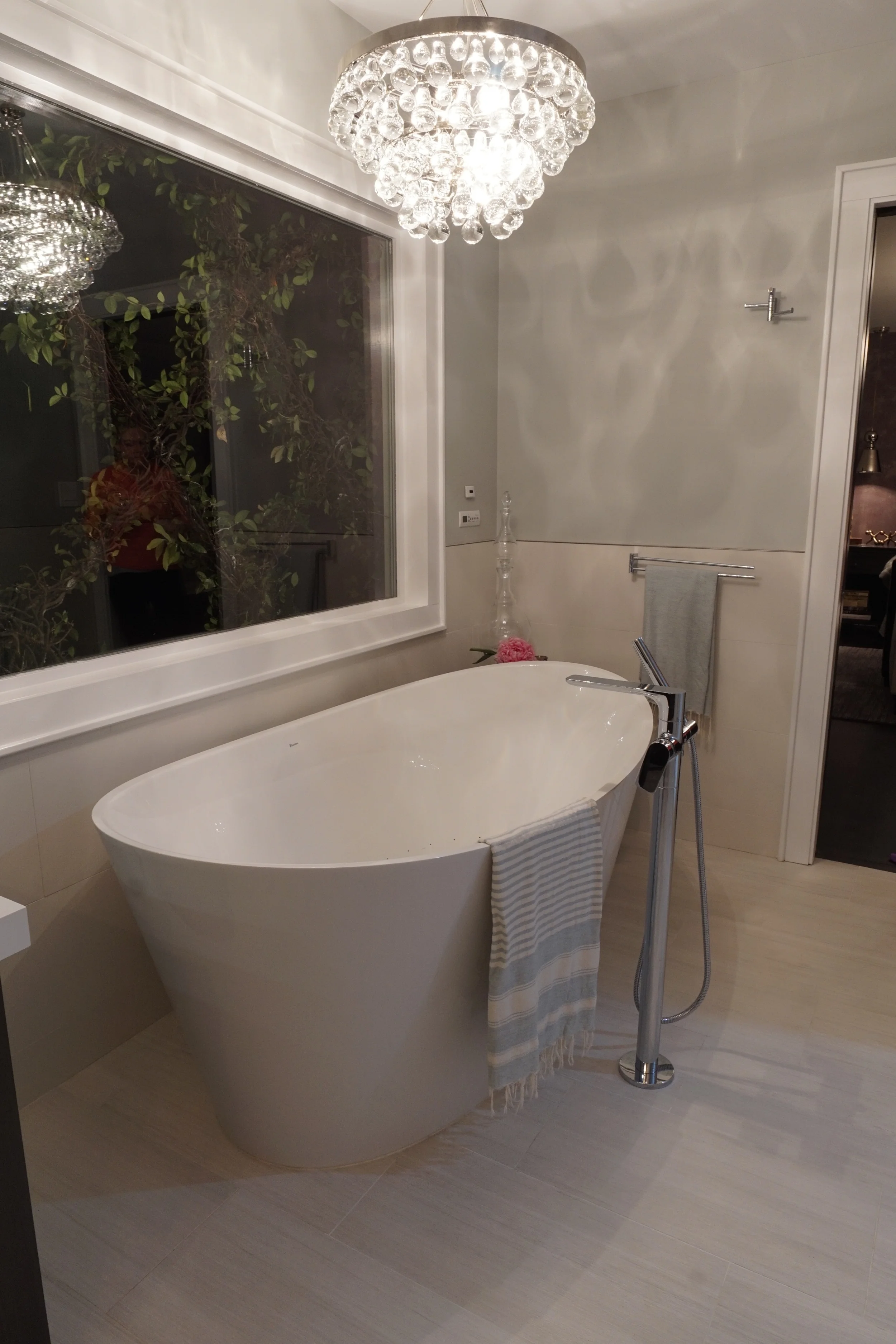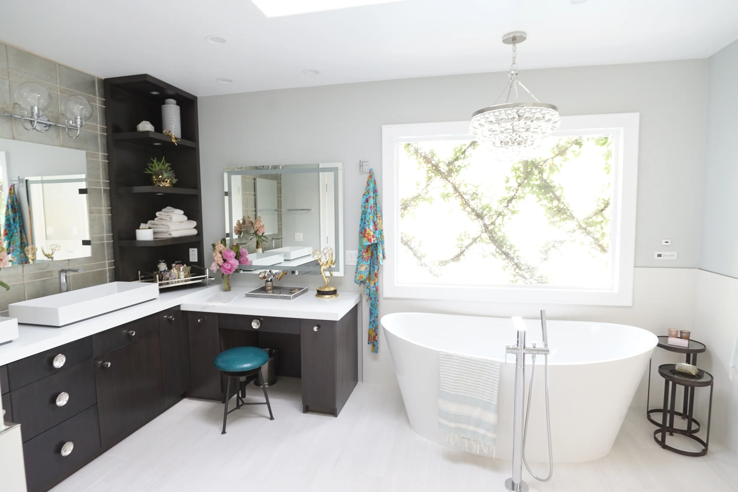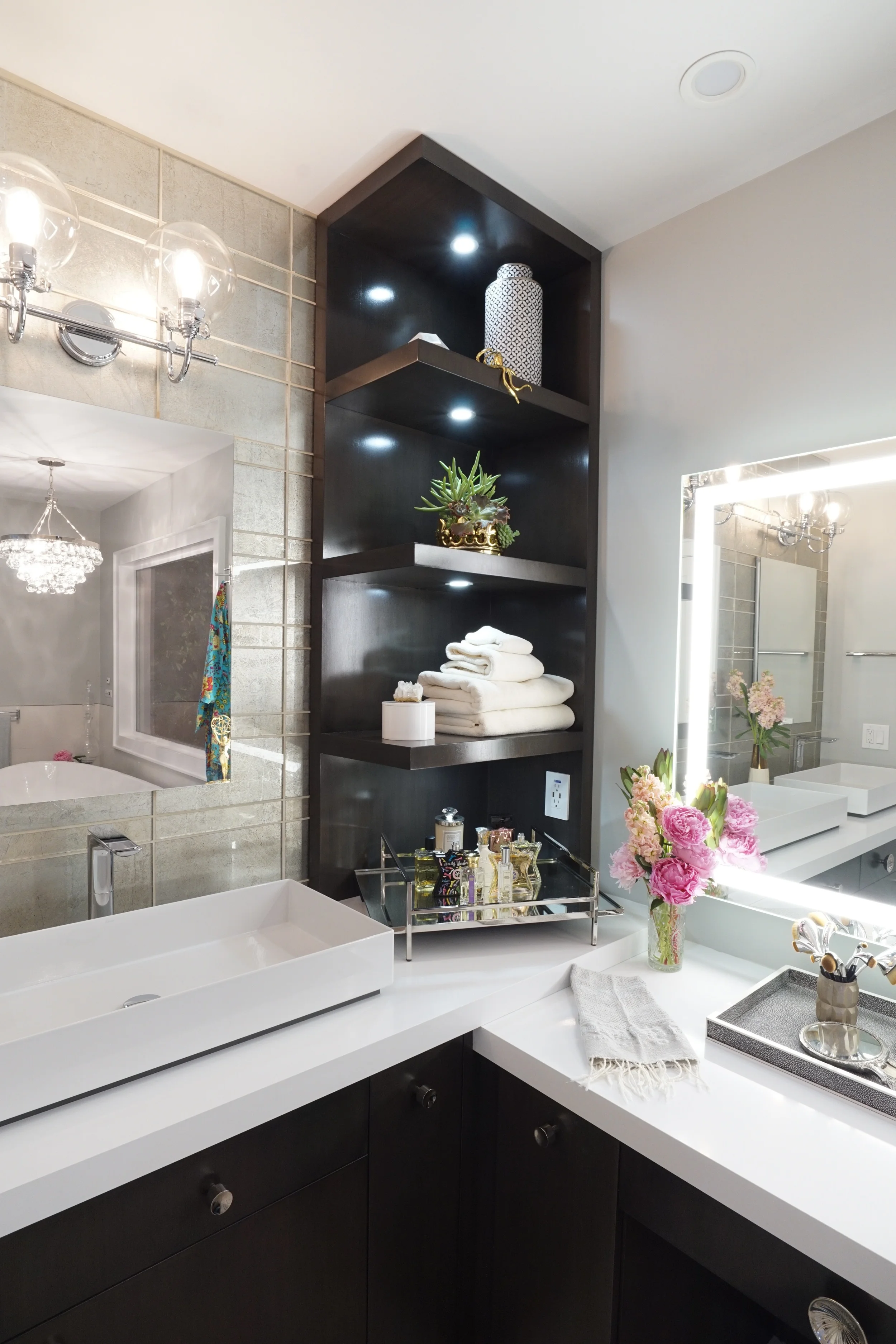 We created a bright, elegant, and glamorous master bath that also functions as a gorgeous, well-lit in-home makeup studio.